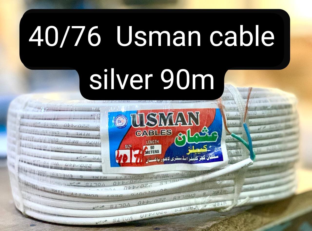 A “40/76 Usman cable silver 90m” is likely a 90-meter length of 1 mm² (or 40/0076″) 2-core flexible cable made from pure copper, possibly silver-plated for enhanced corrosion resistance and conductivity, and used for various domestic and solar power applications such as for UPS, refrigerators, and water pumps