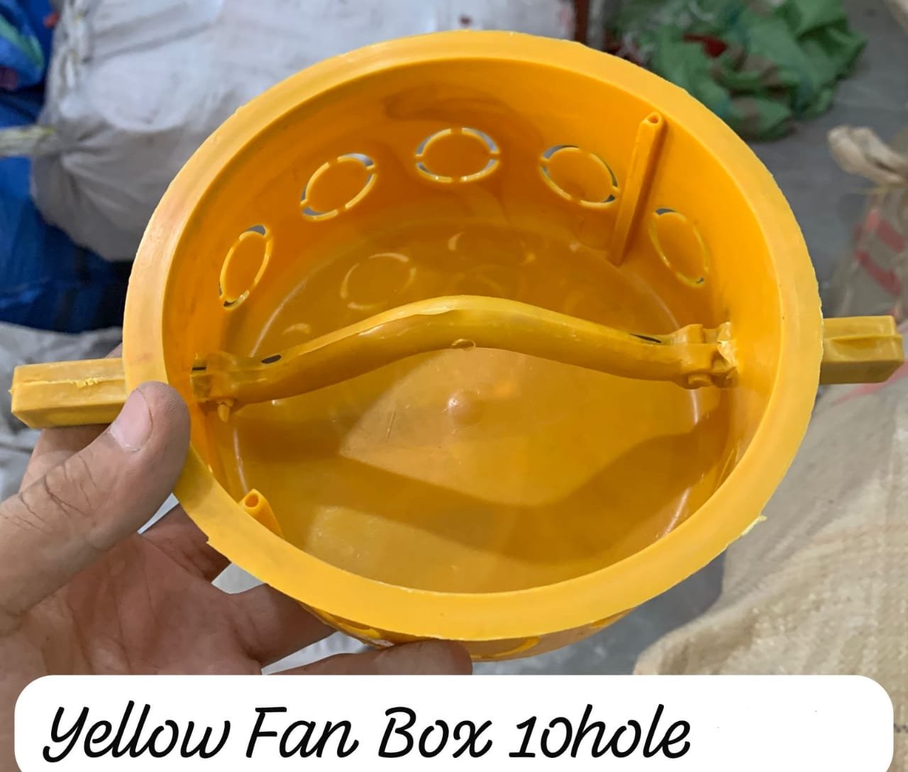 A “Yellow Fan Box 10-hole” is an electrical junction box, likely made of steel or PVC, used for safely mounting ceiling fans and light fixtures. It is often bright yellow for visibility and may feature a specific number of holes or knockouts (such as 10) for electrical cable entry